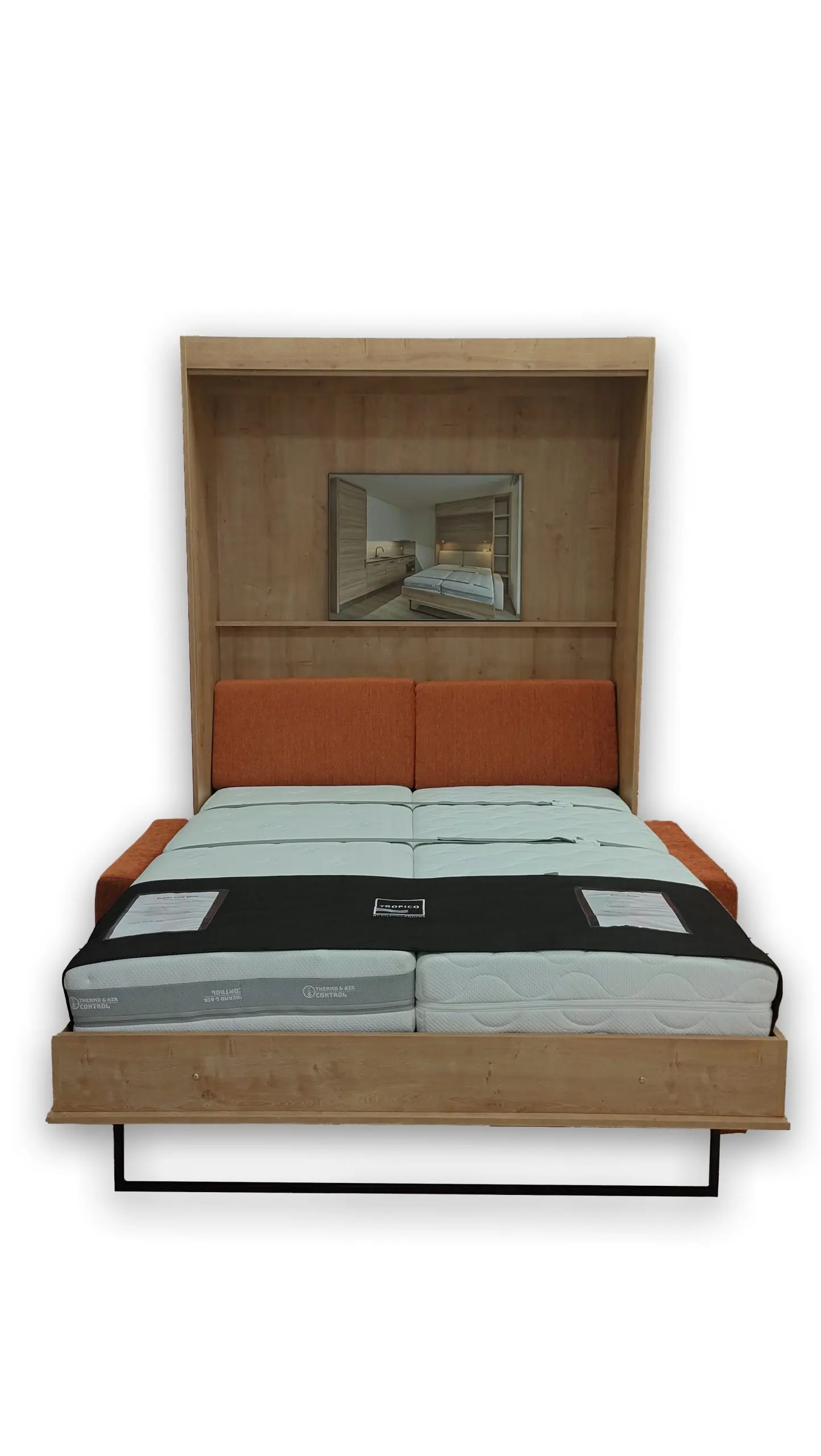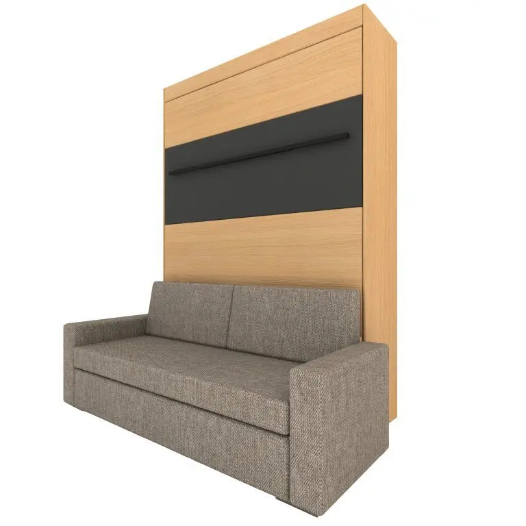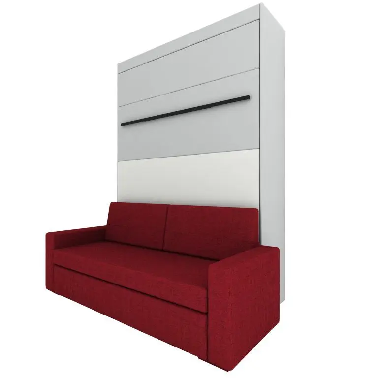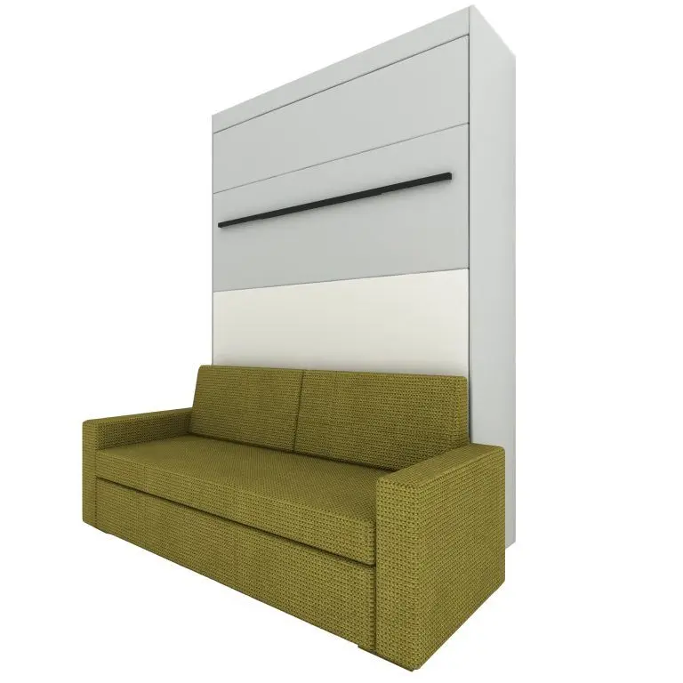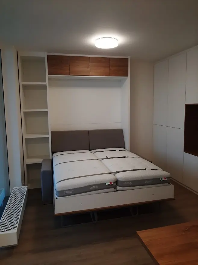 Ve standardní výbavě postele najdete i liniovou úchytku TULIP Resina v černém matu kombinovanou s ocelovou podstavnou nohou rozkládací sedačky, taktéž v černém provedení. Samotný postelový rošt je elegantně opláštěný laminem v dekoru skříně. Opěrné polštáře sedací soupravy jsou odnímatelné a lze je vložit do sklopené postele a využít je tak jako hlavovou opěrku.