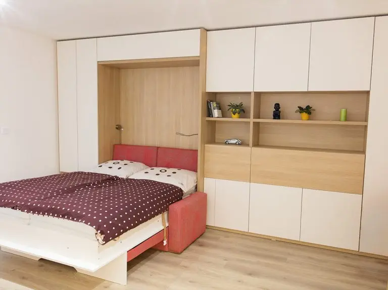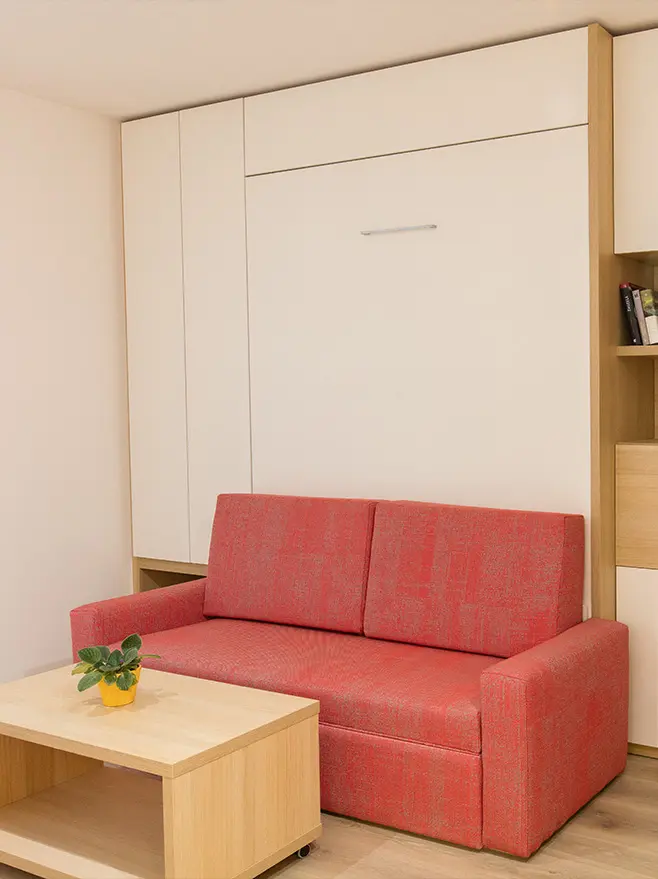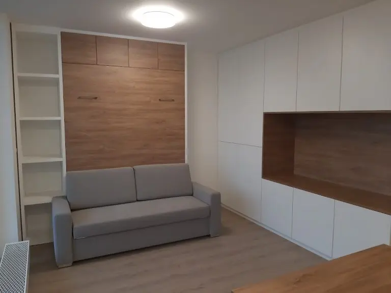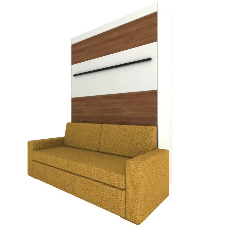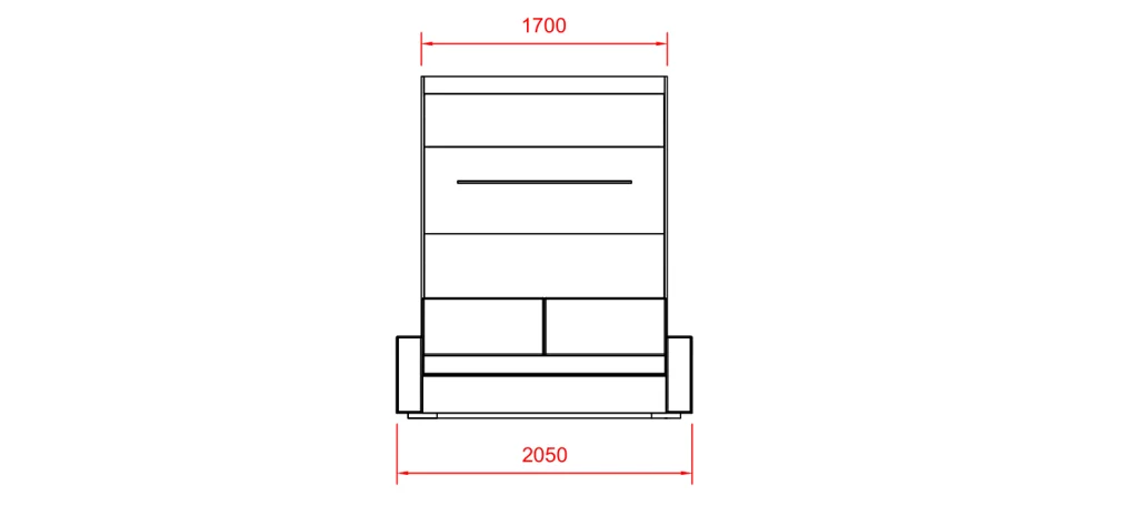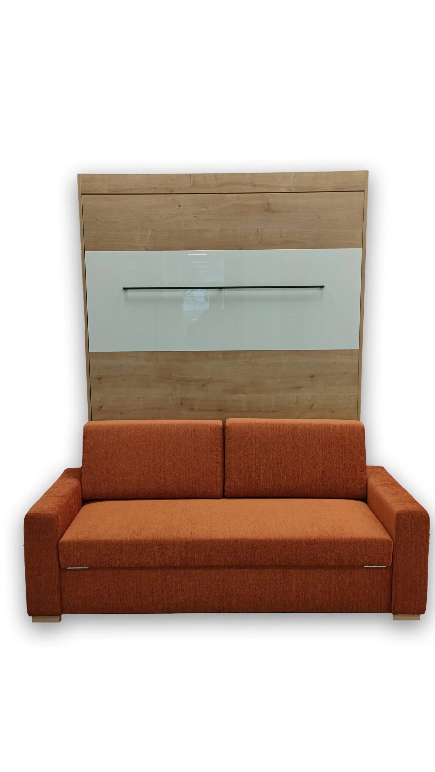 Ve standardní výbavě postele najdete i liniovou úchytku TULIP Resina v černém matu kombinovanou s ocelovou podstavnou nohou rozkládací sedačky, taktéž v černém provedení. Samotný postelový rošt je elegantně opláštěný laminem v dekoru skříně. Opěrné polštáře sedací soupravy jsou odnímatelné a lze je vložit do sklopené postele a využít je tak jako hlavovou opěrku.